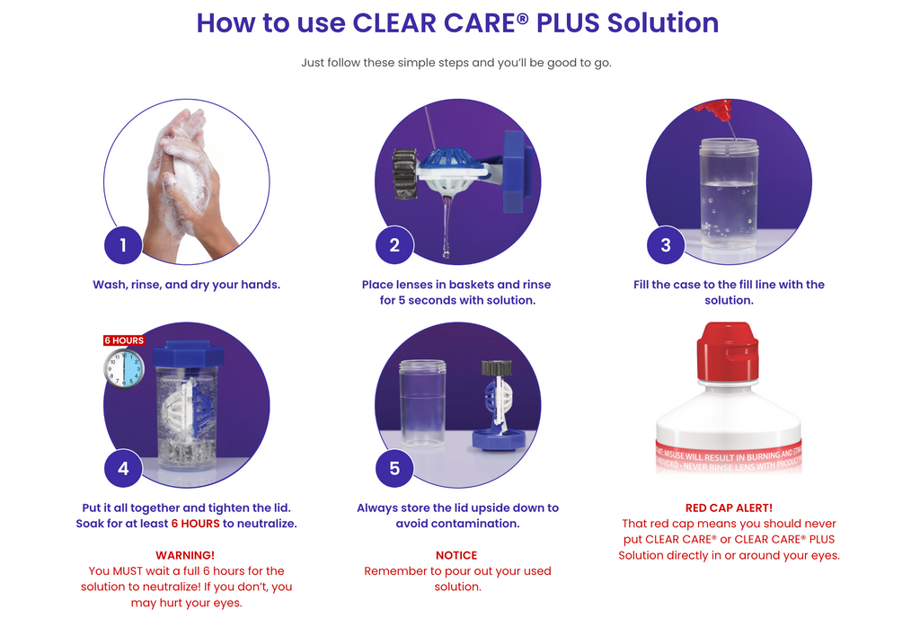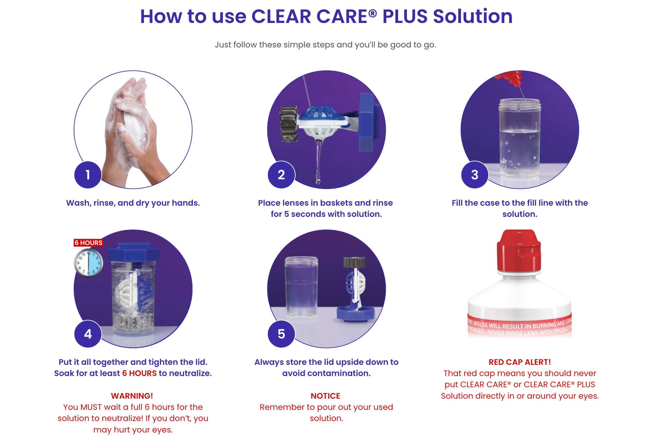 - Lenses must soak in the provided lens case with CLEAR CARE® PLUS solution for at least 6 hours to allow complete neutralization. Inserting lenses before this time can result in eye irritation or injury