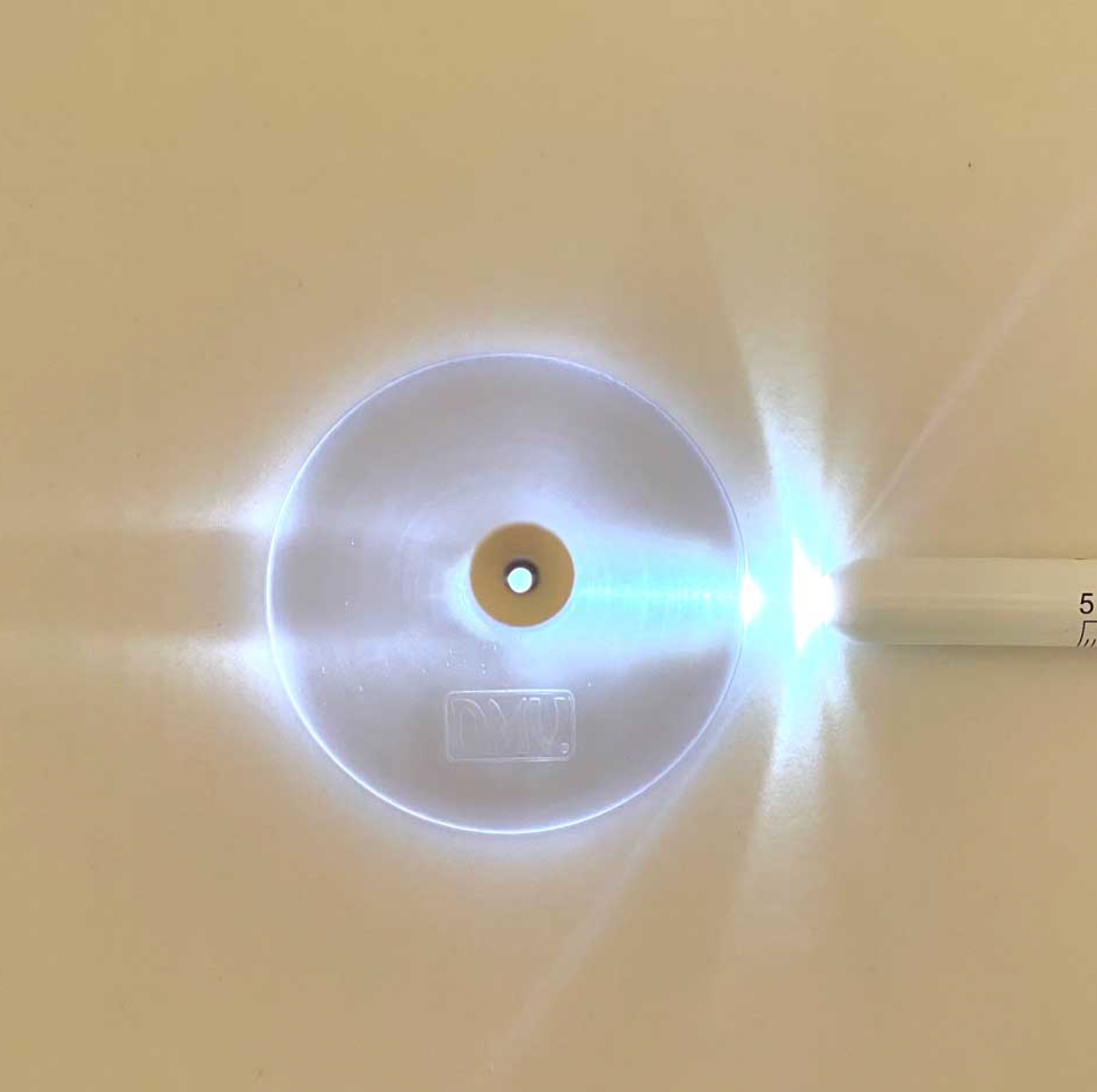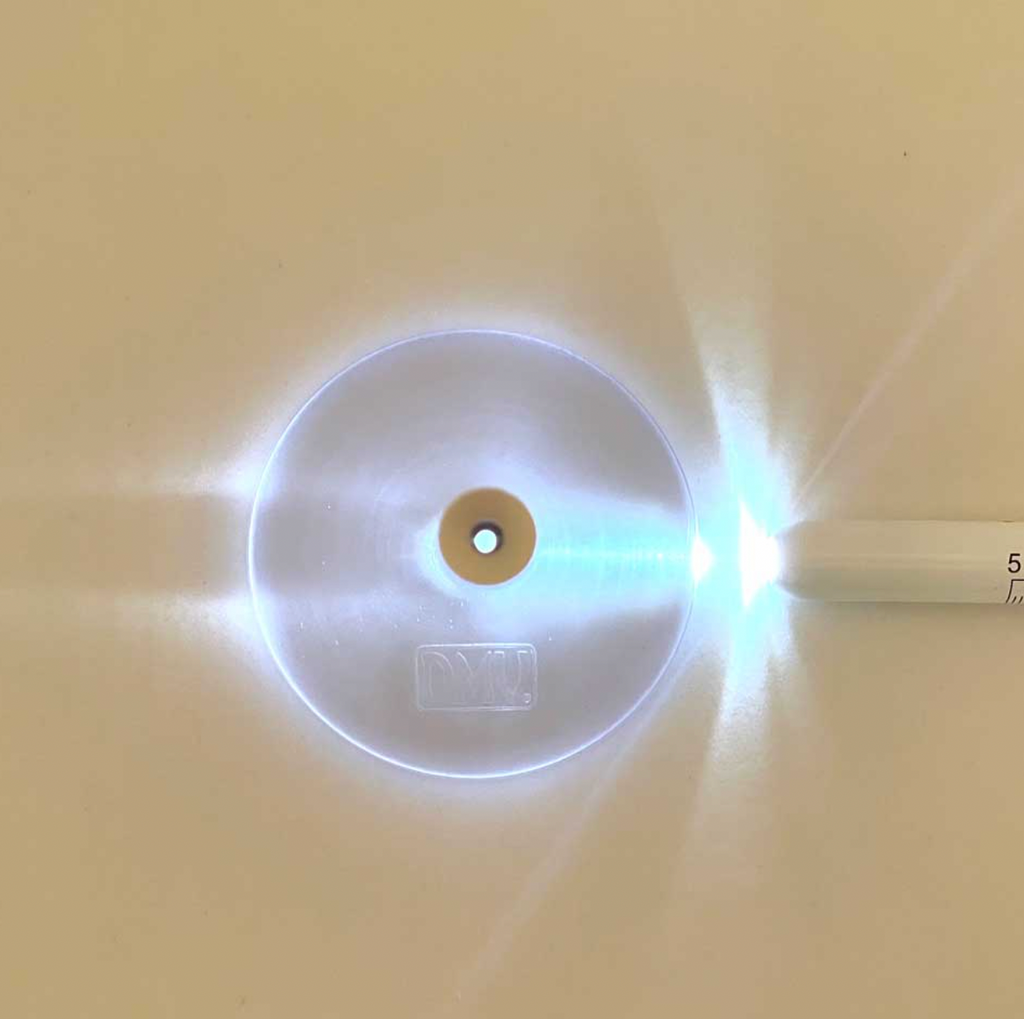 Looking down through the Scleral Stand, the user can use a white background to create a target to help insert their lens. Since the base of the stand absorbs light, the user can also use a flashlight to create a lit target to help guide them for insertion.