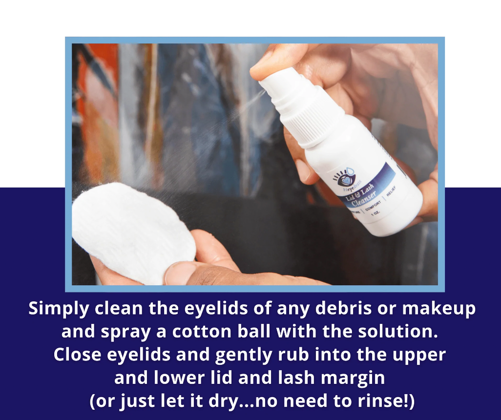 Simply clean the eyelids of any debris or makeup and spray closed eyelids with the solution.