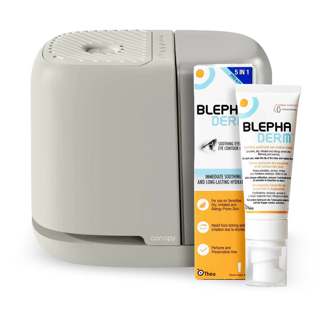 Hydrate sensitive eyelids and reduce inflammation with dermatologist-recommended cream and skin-friendly humidifier for all-day moisture balance. Includes: