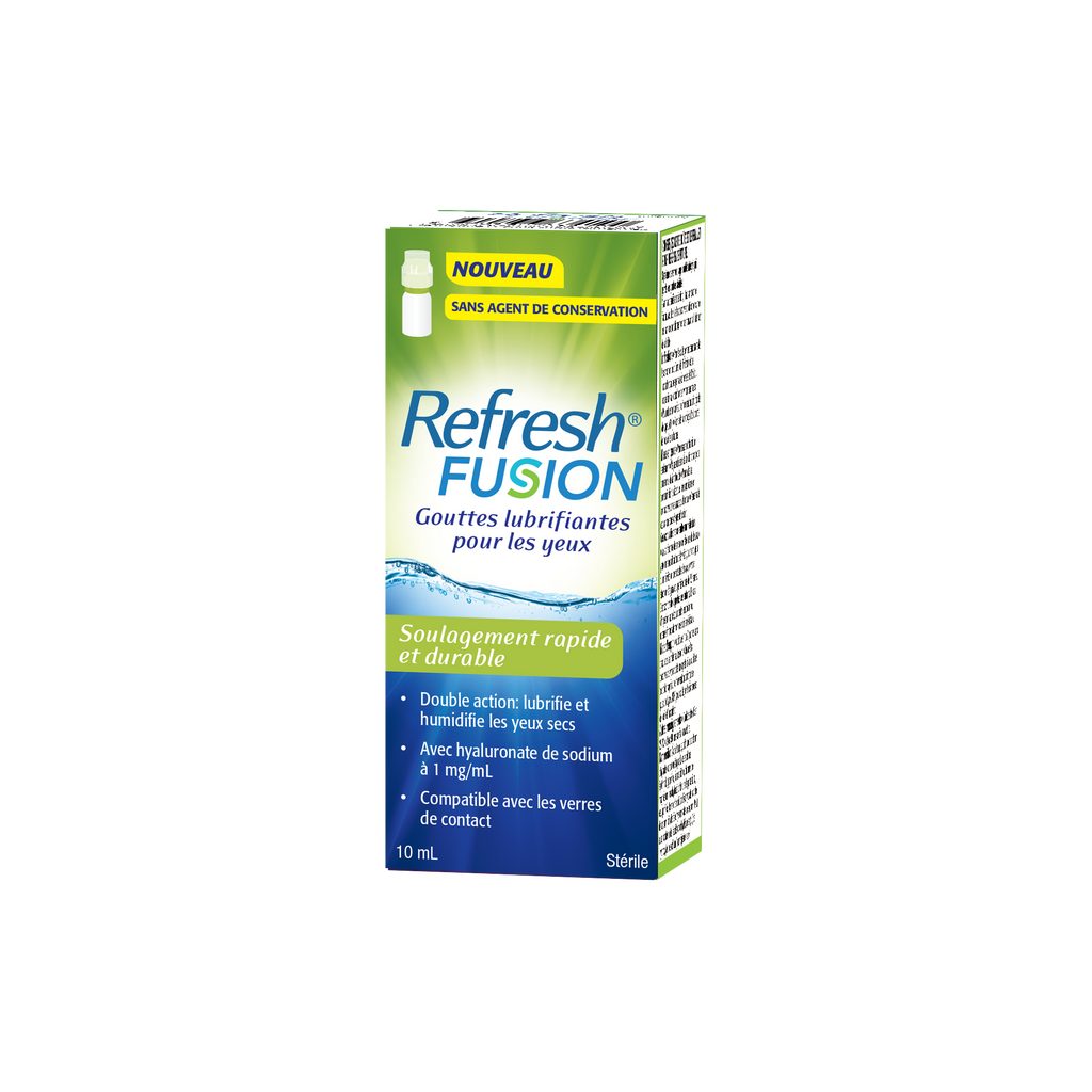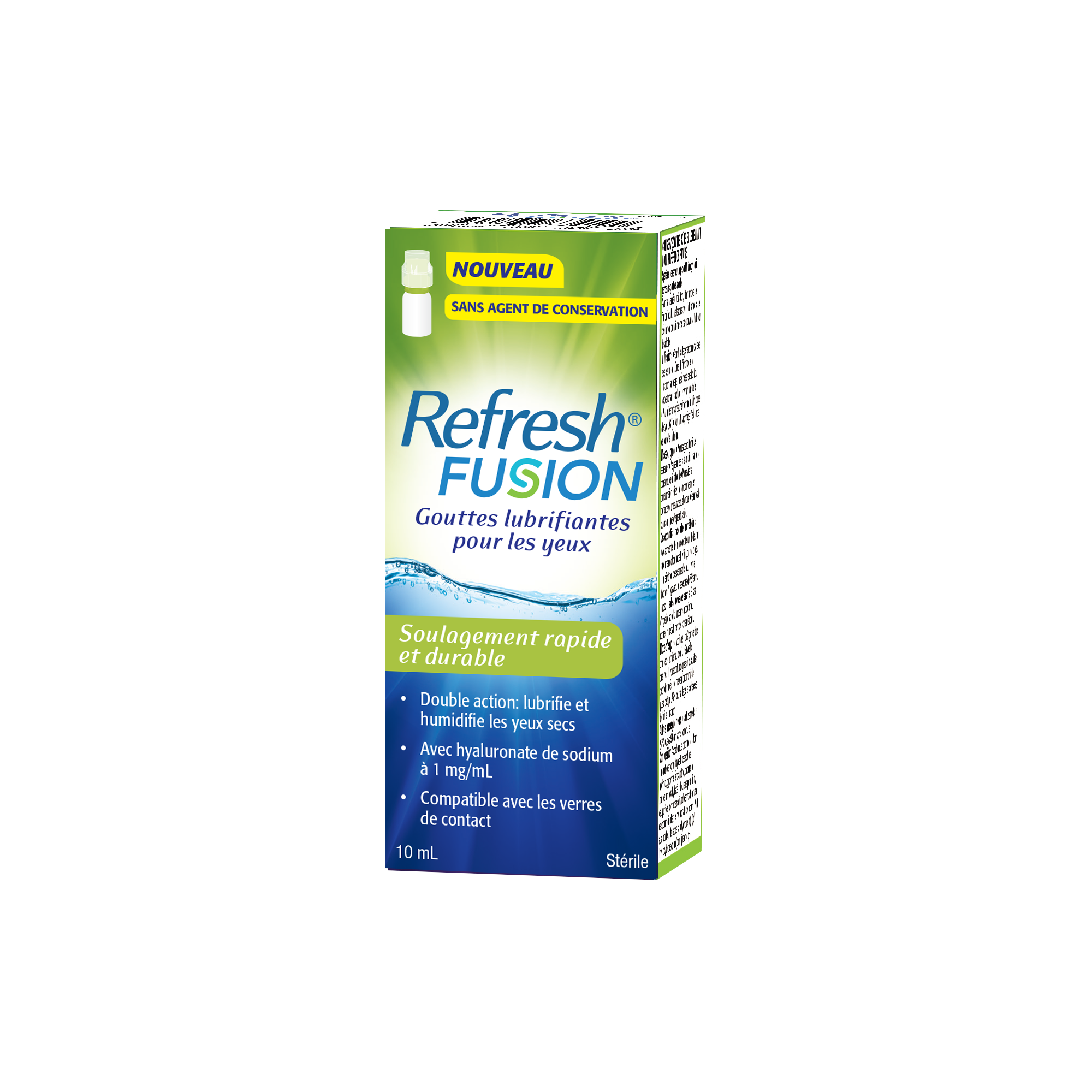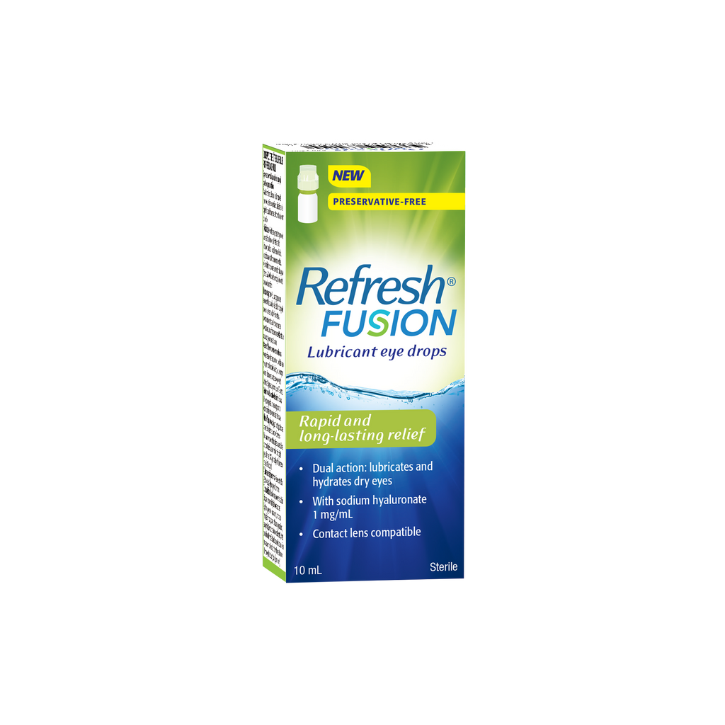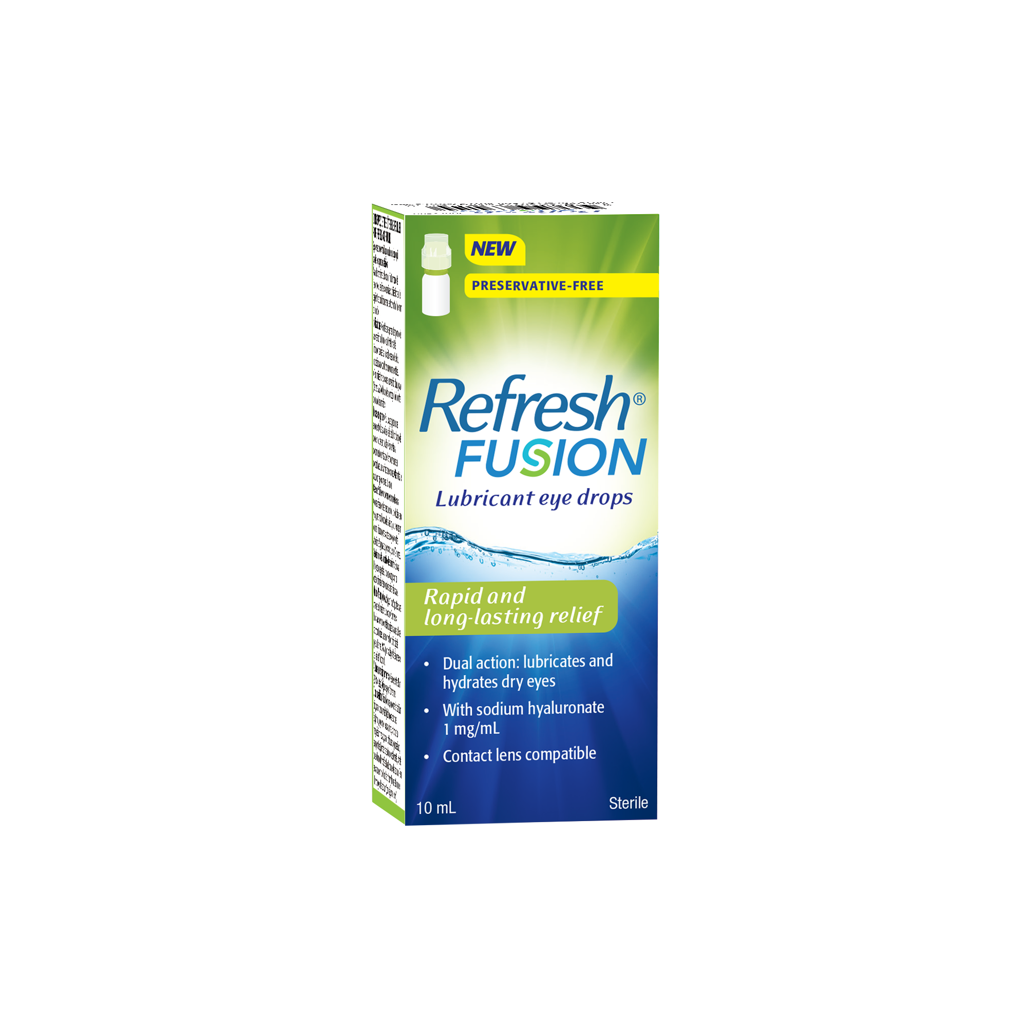 Refresh® Fusion® is a dual action formula that lubricates and hydrates dry eyes. For the temporary relief of burning, irritation, and discomfort due to dryness of the eye or exposure to environmental conditions, and post-surgical use (LASIK). Helps to protect against further irritation.