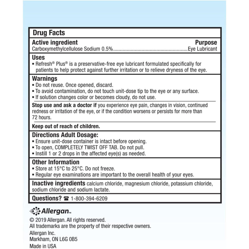 Refresh® Plus® is a preservative-free eye lubricant formulated specifically for patients to help protect against further irritation or to relieve dryness of the eye.