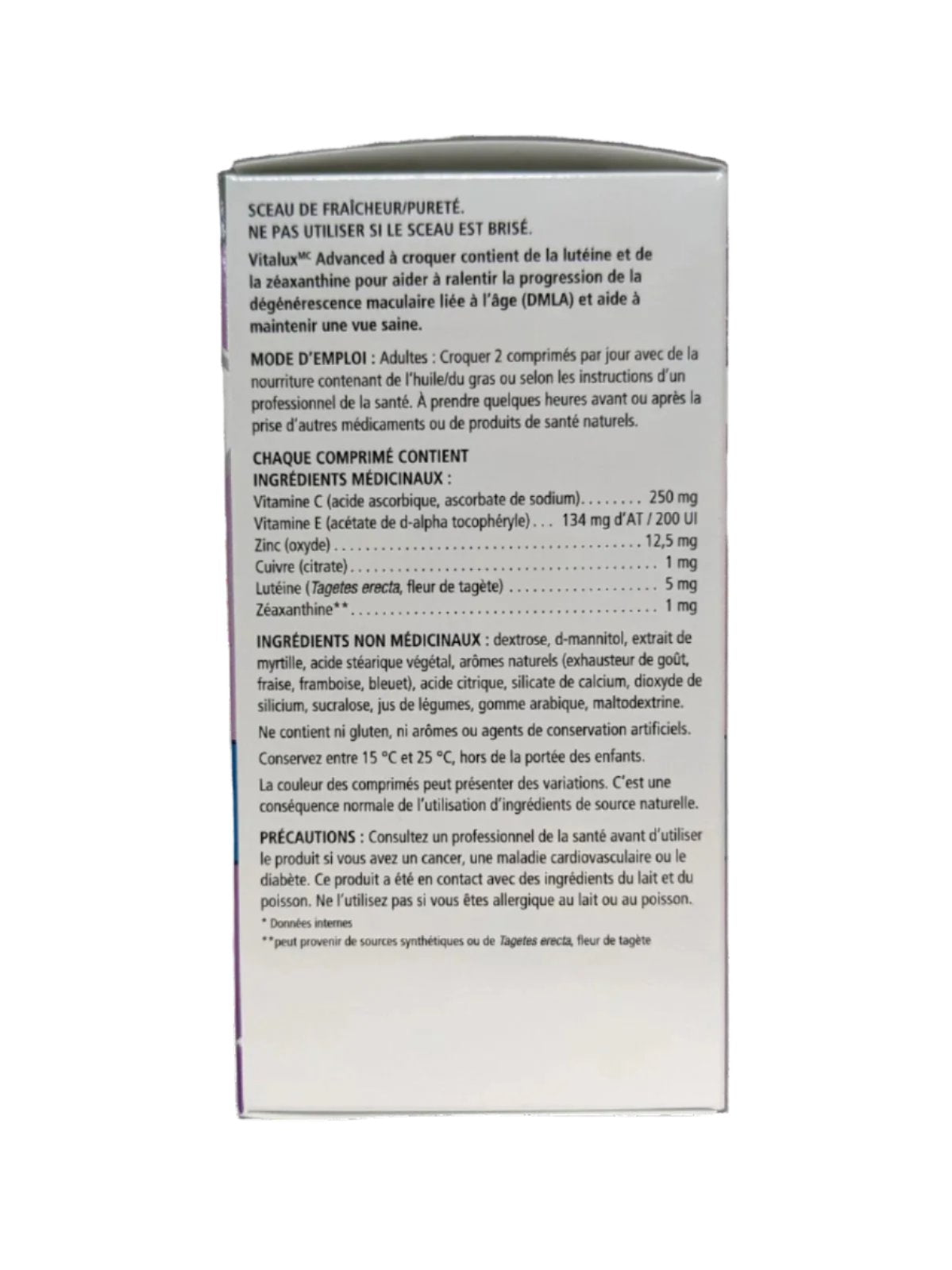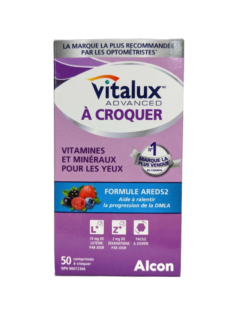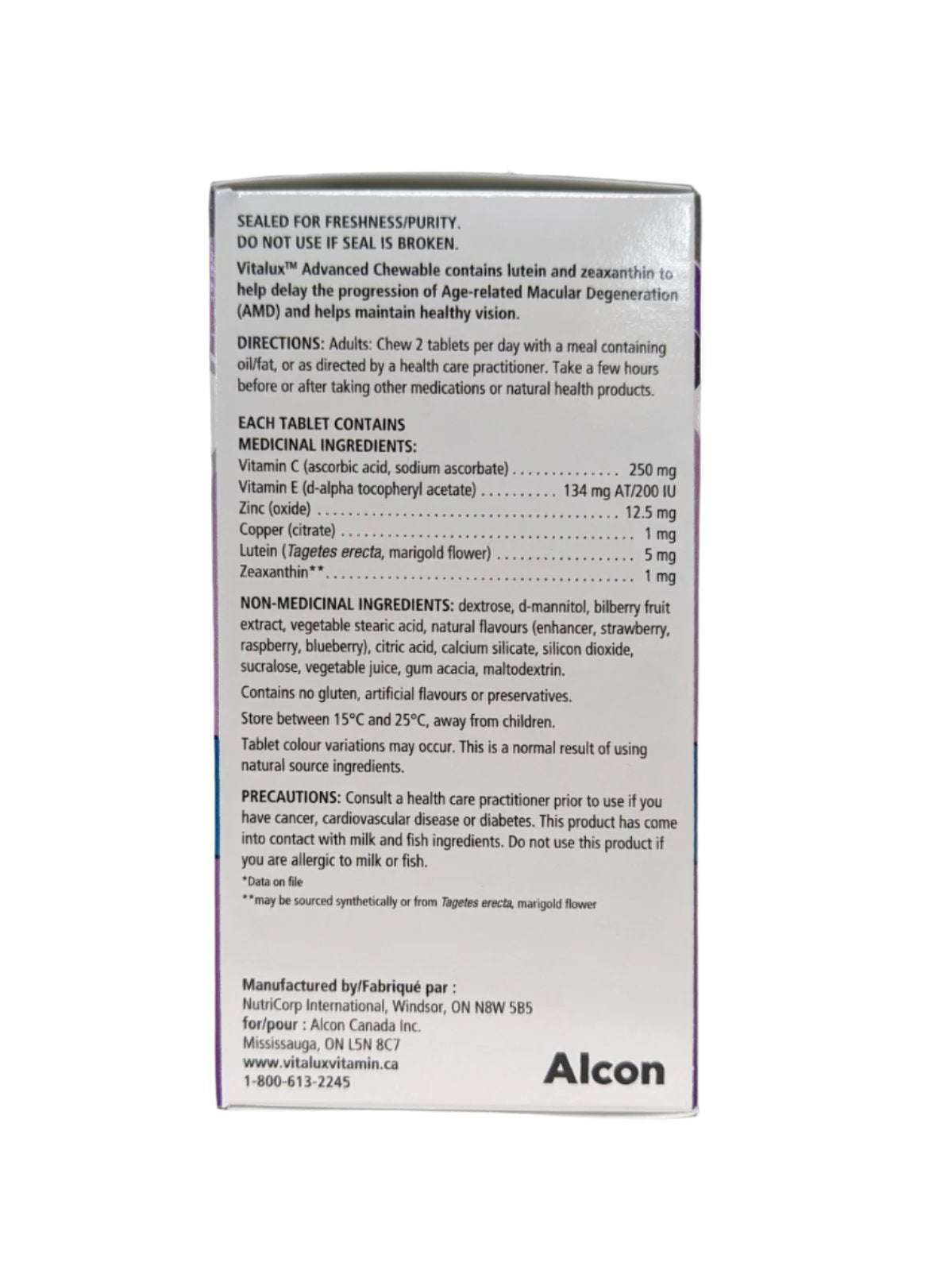 VITALUX® Advanced Chewable is formulated to help delay the progression of Age-related Macular Degeneration (AMD) and help maintain healthy vision. The AREDS2 formula contains the right vitamins at the right doses for AMD; the daily recommended serving (2 chewable tablets) contains 10 mg of Lutein, 2 mg of Zeaxanthin, Vitamin C & E, Zinc, and Copper to support healthy eyes. These chewable ocular vitamins come in a tasty berry flavour making it simple and delicious to help maintain healthy vision.